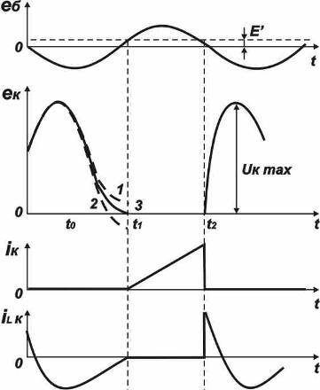 Струм збудження і його частота підібрані так, що в момент t1, відкривається транзистор, конденсатор Ск шунтуєьтся малим опором rнас і коливальний процес припиняється. З'являється струм через індуктивність і наростає пропорційно часу (рис. 5,в).