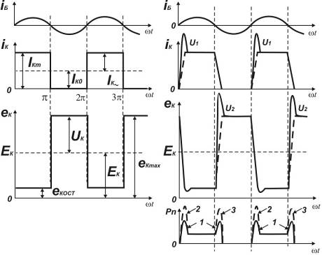 Унаслідок цього на початку кожного імпульсу колекторного струму виникає вузький розрядний імпульс U1, (див. рис. 2,6), а на епюрі потужності втрат з'являється додатковий сплеск 2 (див. рис. 2,6 унизу).