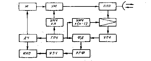 На рис. 4 приведен пример схемы истинно когерентной РЛС высокой скважности. Передатчик построен по многокаскадному принципу. Стабильные колебания задающего генератора промежуточной частоты (ГПЧ) умножаются по частоте и усиливаются в усилителе мощности (УМ). Одновременно в этом же каскаде происходит импульсная модуляция сигнала с высокой скважностью и частотой повторения, зависящей от модулятора (М). С помощью второго умножителя частоты (УМЧ), на который подаются колебания задающего генератора промежуточной частоты, формируется гетеродинный сигнал, используемый для преобразования частоты принимаемых сигналов в смесителе приемника. Усиленные в УПЧ сигналы сравниваются с опорным колебанием генератора промежуточной частоты на фазовом детекторе (ФД).
