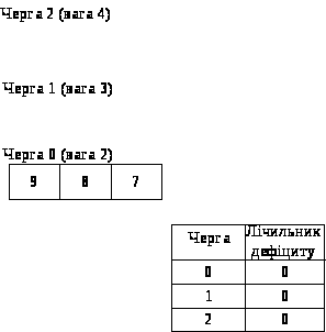 Рисунок 7 - Стан черг і відповідних їм значень лічильників дефіциту після першого циклу обслуговування черги 0