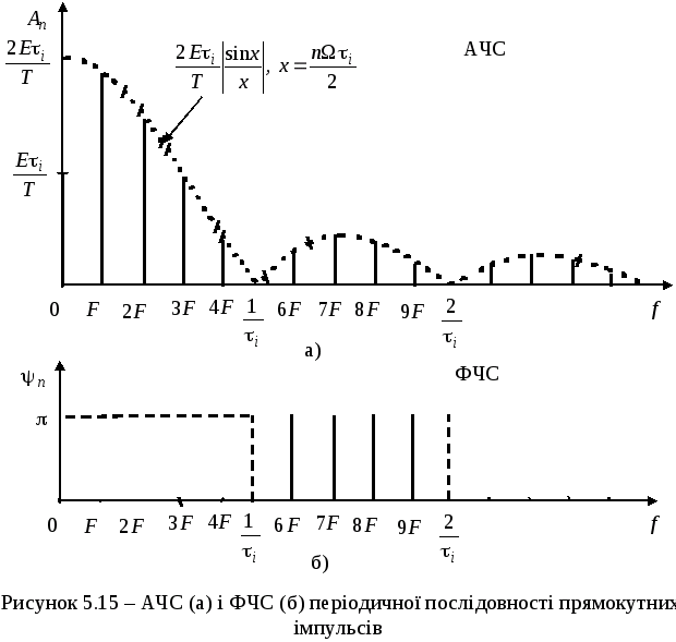 Рисунок 9 – АЧС (а) і ФЧС (б) одиночного прямокутного імпульсу наведеного на рис. 8,а