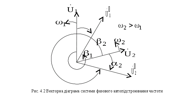 У зв'язку з тим, що по пропонованому способі одержання постійного часу випередження ω>i>>ω>0>, для зрушення по фазі синхронізуємих напруг U>1> і U>2> варто використати не кути α>1> і α>2>, отримані в системах фазового автопідстроювання частоти, а їхнє доповнення до 360˚.