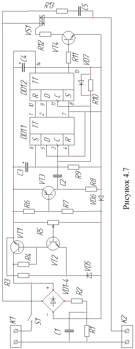 Діод VD3 і VD5 служить для прив’язки моментів нульової напруги в мережі до входу «С» тригера DD1. В ці моменти нульовий потенціал на вході С тригера в ці моменти.