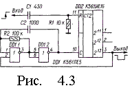 Рекомендуемое сопротивление времязадающего резистора — не менее 1 кОм. Его максимальное сопротивление ограничено лишь током утечки времязадающего конденсатора и монтажа и достигает десятков мегаом. Емкость времязадающих конденсаторов не ограничена. Длительность формируемого импульса можно рассчитать по формуле Tи= (0,3...0,5)RC. При этом удобно пользоваться размерностями МОм, мкФ, с или кОм, мкФ, мс, или кОм, нф, мкс. При емкости конденсатора менее 10 нФ реальная длительность импульса получается большей, чем при расчете.