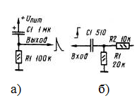 Для установки цифровых устройств в исходное состояние при включении питания можно применить простейшую RC цепь по схеме на рис. 1.1,а, формирующую импульс сброса положительной полярности. Для формирования короткого импульса положительной полярности при изменении уровня входного сигнала с нулевого на единичный служит схема, приведенная на рис. 1.1,б.