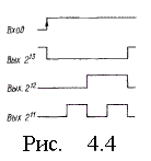 Одновибратор, выполненный по схеме, приведенной на рис. 1.4.3,а, работает следующим образом: в исходном состоянии устройства на выходе счетчика DD2 присутствует напряжение высокого уровня, запрещающее работу генератора, собранного на элементах ИЛИ-НЕ (DD1.1. DD1.2) микросхемы DD1. При импульсе высокого уровня на входе счетчик DD2 обнуляется — на его выходе появляется напряжение низкого уровня, разрешающее работу генератора. После того, как счетчик отсчитает 213 импульсов, на его выходе появится напряжение высокого уровня, запрещающее работу генератора. Таким образом, по фронту импульса на входе запуска на выходе устройства формируется импульс низкого уровня длительностью в 213 импульсов задающего генератора. При этом на выходе 212 (вывод 2) счетчика формируется импульс высокого уровня вдвое меньшей длительности, заканчивающийся одновременно с основным низкого уровня, на выходе 211 (вывод 2)—два импульса и т.д. рис. 1.4.3,б. Поскольку формирование выходного импульса всегда начинается из одного и того же состояния задающего генератора, то исключается случайная погрешность длительности импульса, связанная с неопределенностью фазы генератора.