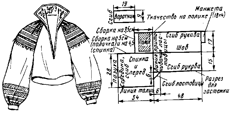 В мудрости народного кроя емкие функции. Каждая основная деталь с прямыми линиями кроя, а также и полики, клинья, ластовицы рукавов не только несут конструктивные и эстетические функции, но и способствуют экономичности кроя. Прямой крой крестьянской народной рубахи дает основание считать ее единой конструктивной основой. В южных областях прямой крой рубах усложнился введением деталей поликов.