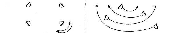 Такты 1—4: «переступаниями накрест» (движение 4) две девушки продвигаются с правой ноги влево, другие две — с левой ноги вправо (cхема 8).