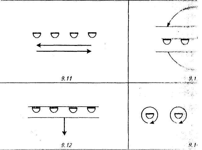 Такты 5—7: «переменным ходом» (движение 1) попарно обходят друг друга (схема 9), отводя руки с платком влево.