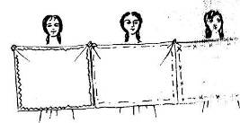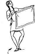 Т а к т ы 8—11: «переменным ходом» (движение 1) медленно продвигаются вперед, соединив руки мизинцами друг с другом. На два такта поднимают платки вверх, закрывая лица, на два такта опускают вниз (схема 12; рис. 7).