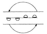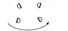 Такты 1—7: две девушки поворачиваются на полповорота вправо, и все танцующие «переменным ходом» (движение 1) шеренгой вращаются против часовой стрелки (схема 13). Руки соединены мизинцами друг с другом. Такты 8—11: две девушки поворачиваются на пол поворота влево. Все «переменным ходом» идут вперед (в сторону точки 1), приподнимая и опуская платки.