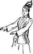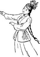 «Саныр-муйiз» Одну руку отвести в сторону, другую поднять во 2-ю позицию ладонью к себе, ладонь протянутой руки протянута вниз.
