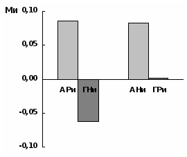 По-прежнему высокой и достоверно отличающейся от нуля (p<0,01) является самооценка русских (АРи). Что же касается самооценки немцев (АНи), то она, не отличавшаяся от нуля по данным эксплицитного опроса, теперь становится достоверно выше нуля ((p<0,05) и практически сравнивается в абсолютном выражении с автостереотипом русских. Гетеростереотипы (представление о другом этносе) меняются в противоположном направлении – возрастает степень представленности в них отрицательных качеств. В немецкой выборке эксплицитный позитивный образ «типичного русского» превращается в нейтральный (ГРи), а в российской выборке эксплицитный позитивный образ «типичного немца» превращается в негативный, в котором (ГНи) отмечается достоверное (p<0,05) преобладание отрицательных качеств над положительными. Также достоверным (p<0,001) является различие между самооценкой русских (АРи) и их оценкой немцев (ГНи).
