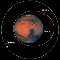 У Марса имеются два спутника Фобос и Деймос. Фобос имеет размеры 28*20*18 км. Деймос меньше, его размеры 16*12*10 км. Состоят они из одной и той же темной породы, похожей на вещество некоторых метеоритов и астероидов. Поверхность изрыта метеоритными кратерами. Крупнейший кратер на Фобосе - Стикни, его диаметр 10 км. Предполагается что спутники Марса - астероиды, захваченные планетой из Пояса Астероидов.