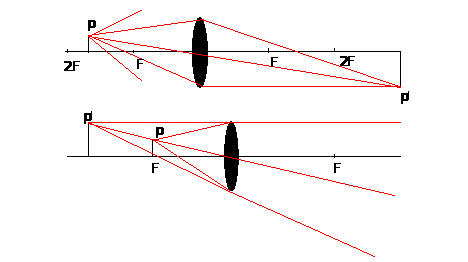 б – точка P’ – мнимое прямое увеличенное изображение точки P.