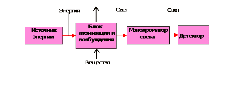 При изучении спектров испускания (эмиссионных спектров) к пробе необходимо подвести энергию, достаточную для того, чтобы разорвать связи между атомами, то есть атомизировать вещество, а затем возбудить образовавшиеся атомы. Испускаемые фотоны фокусируют, разделяют по энергиям и оценивают излучение по энергии при интенсивности (рис.7).