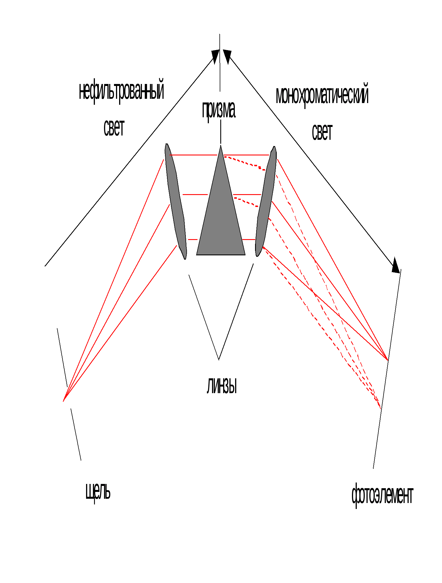 При спектрофотометрическом анализе световой поток видимого или ультрафиолетового излучения от источника света через систему оптических зеркал попадает в монохроматор, где свет разлагается на отдельные компоненты, из которых выходная щель монохроматора в зависимости от угла поворота решетки выделяет свет определенной длины волны (близкого диапазона волн). Такой «профильтрованный» свет и попадает на образец. Путем поворота монохроматора можно добиться того, что на анализируемый образец. Путем поворота монохроматора можно добиться того, что на анализируемый образец будет попадать свет заданной длины волны. Интенсивность светового потока, проделавшего путь от источника излучения через монохроматор и образец, измеряется в фотоприемнике. По устройству спектрофотометры, работающие в видимой и ультрафиолетовой областях спектра, между собой почти не отличаются, однако для исследования в ультрафиолетовой области необходим особый источник излучения и специальные кварцевые кюветы, поскольку обычное стекло поглощает ультрафиолетовые лучи.