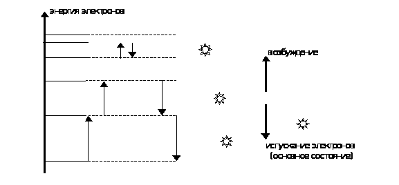 Известно, что при нагревании тела скорость перемещения (диффузии) отдельных компонентов увеличивается По мере увеличения температуры твердого тела, прежде всего, разрушается кристаллическая решетка, затем вещество переходит в жидкое состояние и, в конце концов, происходит испарение (переходит в пар). Что же произойдет при дальнейшем повышении температуры? Представим себе, танцевальные пары в переполненном зале вынуждены двигаться все быстрее и быстрее; столкновения станут неизбежны со всеми вытекающими последствиями. В паровой фазе также при нагревании, то есть при поступлении дополнительной энергии, молекулы вынуждены разрушаться, то есть диссоциировать на отдельные атомы. Энергию, сообщаемую атомам при многократных соударениях, прежде всего воспримут электроны, расположенные на внешних оболочках, то есть валентные электроны. Допустим, что после очередного удара валентный электрон поглощает дополнительную энергию. Если последняя достаточна для перехода электрона на незанятый электронный уровень с более высокой энергией, совершается соответствующий электронный переход, и атом оказывается в так называемом возбужденном состоянии. Возбужденное состояние атома неустойчиво, и рано или поздно электрон вновь возвратится на свою основную орбиту, и атом потеряет приобретенную энергию, испуская фотон (рис.6).