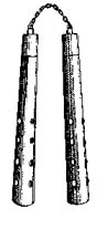 Нунчаку (Нунтяку) - традиционное ударно-раздробляющее холодное оружие в странах Юго-Восточной Азии, Китае и Японии. Состоит из двух (реже 3,4 и даже 5) деревянных ударных элемента (дубинка), соединенных между собой подвесом. Длина ударных элементов 25-35 см, длина подвеса у китайского варианта 20-30 см, у японского - по ширине кисти руки владельца - 7-11 см. В ряде зарубежных стран Н. выпускаются промышленностью из современных материалов (металла, пластмассы и т.д.). Масса ударных элементов и боевых нунчак не менее 100 г. каждого, у спортивных нунчак, предназначенных для обучения и тренировок, меньше 100 г. (обычно легкие, из бамбука). Высокоэффективное применение нунчаку требуют специального обучения и длительной тренировки, что позволяет осуществлять нападение и защиту не только путем нанесения ударов, но и удушения противника или ущемления его конечностей.