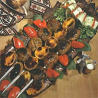 Из масла, лука, молотого красного перца и кинзы сделать зажарку. В нее положить мясо, нарезанное порционными кусками и протушить 10-15 минут, затем положить мелко нарезанные помидоры или пасту, посолить чесночной солью и еще потушить 10-15 минут. Разрезанную кусками капусту вместе с сердцевиной также заложить в мясо. Добавить зелень, горький и сладкий перец и довести блюдо до готовности.