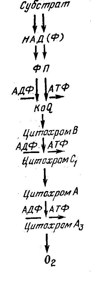 Процесс окисления субстрата в дыхательной цепи сопровождается фосфорилированием АДФ и запасанием энергии в форме АТФ. В цепи окисления есть три участка фосфорилирования: участок окисления флавопротеидов, участок перехода электронов от цитохрома В к цитохрому С и участок перехода электронов от цитохрома А к цитохрому Аз (рис. 1).