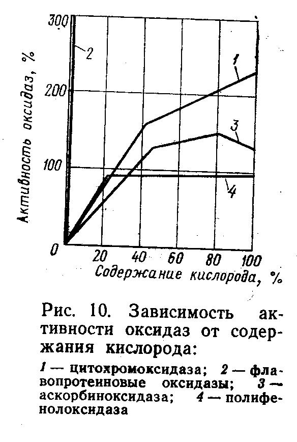 Наибольшее сродство к кислороду имеет цитохромоксидаза, ее действие проявляется при содержании кислорода в атмосфере всего 1 %. Глубинные слои паренхимной ткани плодов и овощей, для которых характерно пониженное содержание кислорода, более богаты цитохромоксидазой, нежели поверхностные.