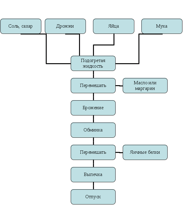 В подогретой до 35—40 0 С жидкости растворяют соль, сахар, разведенные дрожжи, кладут яйца, всыпают муку и перемешивают до однородной консистенции, вводят растопленный маргарин или масло, снова перемешивают и ставят в теплое место(25—35 0 С) для брожения на 3—3,5 часа. В процессе брожения тесто обминают 2—3 раза.