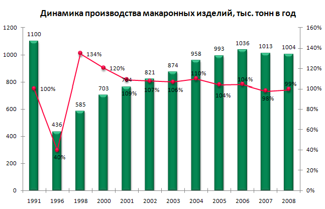 Также необходимо обратить внимание на тот факт, что объем производства макаронных изделий вплотную приблизился к 1991 году, когда он составлял 1100 тыс.т в год. Мировой экономический кризис, конечно же, начинает вносить свои коррективы, хотя ситуация кардинально отличается от российского кризиса 1998 года. По данным ряда крупнейших игроков, наблюдается увеличение спроса на продукцию, особенно с начала 2009 года.