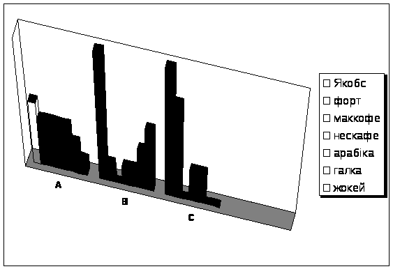На гістограмі Рис 4.7 наведено схему розподілу смакових пристрастей у виборі різних сортів кави у різних вікових категорій. Як видно у всіх вікових категорій опитані дали перше місце каві «Якобс», на другому місці по кількості голосів кава «Форт». Кава «Мак кофе» та «Нескафе» зі зростанням віку споживачів зменшує кількість прихильників. Кава «Арабіка» та «Галка» мають мінімум споживачів у віковій категорії В. Кава «Жокей» має максимум голосів у середній віковій категорії. Отже, для керівництва кафе-бар «Торнадо» ТзОВ «Сафо» можна подати пропозицію вказувати у меню марку якої кави вони пропонують, та приділити увагу марці кави «Якобс» та «Форт».