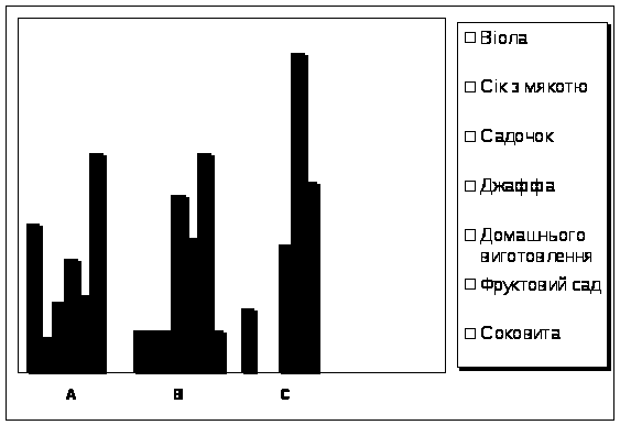 На Рис.4.10 наведено розподіл смаків споживачів у виборі різних марок соків. Як видно з гістограми стабільно популярна марка «Фруктовий сад». Соки «Джаффа» та сік «Домашнього виготовлення» збільшують кількість своїх прихильників зі зростанням віку споживачів. А соки «Віола», «Садочок», «З м’якоттю» зі зростанням віку респондентів зменшують кількість прихильників. Отже кафе-бар «Торнадо» ТзОВ «Сафо» можна пропонувати розширити свій асортимент соків за рахунок соків марок «Фруктовий сад», «Джаффа», сік «Домашнього виготовлення» (за для чого як вже пропонувалося придбати соковижималку), «Віола», «Садочок».