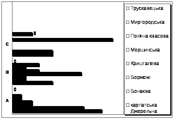 На Рис. 8. наведено схему розподілу смакових переваг у виборі різних сортів мінеральних вод у різних вікових категорій. Як видно «Карпатська джерельна з віком повільно втрачає кількість своїх прихильників. «Поляна квасова» навпаки, з підвищенням вікової категорії здобуває більшу кількість прихильників. «Бонаква» має мінімум у середній віковій категорії, а «Кришталева» навпаки має у цій віковій категорії максимум споживачів. Решта видів мінеральних вод які обрали споживачі з переліку 10 найвідоміших на Україні мінеральних вод мають стабільно низькій відсоток своїх прихильників. Для керівництва кафе-бар «Торнадо» ТзОВ «Сафо» можна подати пропозицію збільшити асортимент мінеральних вод, та лікувально-столових мінеральних вод, так як у переліку напоїв кафе-бар «Торнадо» ТзОВ «Сафо» не присутні марки «Кришталева», «Поляна квасова», «Карпатська Джерельна», «Боржомі», що користуються стабільним попитом відвідувачів.