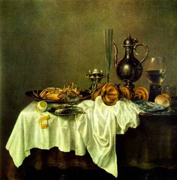 Завтраки были излюбленной темой ещё одного голландца, Виллема Класса, каждый предмет на его картинах был произведением искусства: золотые часы, серебярный бокал и серебряное блюдо. Каждый предмет представлен в свооём великолепии.
