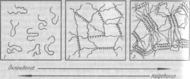 Рисунок 1. Изменение структуры водных систем желатина при нагревании и охлаждении: 1,2 - молекулярно-дисперсная система; 3 - студень с тройными связями.