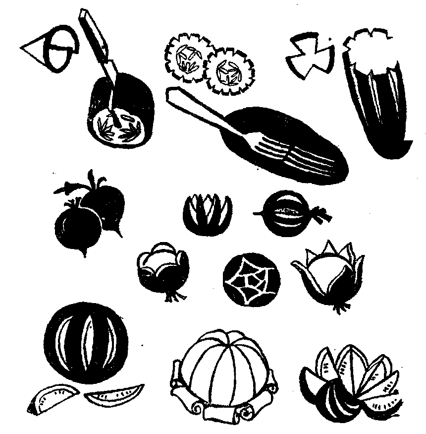 Поэтому хорошо созревшие овощи, а также фрукты подают к столу свежими, связанными в пучок или разрезанными на большие куски, например, редис, огурцы, помидоры, зеленый лук, морковь, яблоки, груши, сливы и др.