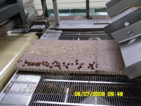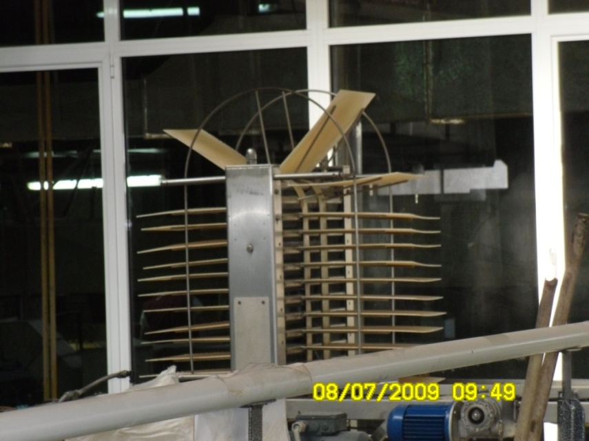Чтобы получить вафельный лист, тесто готовят с высоким содержанием влаги - очень жидкое, сметанообразное. Для этого смешивают муку, меланж (вместо яиц), фосфатиды, растительное масло, соль, соду, воду. Яичные желтки и фосфатиды помогают отделять вафельные листы от форм, а также предохраняют их от ломки. Пористость теста достигается добавлением специальных разрыхлителей, а также его взбиванием. Готовое тесто сливают в бачок. С него автоматически с помощью насоса через разливочную трубу дозируется на поверхность формы. Тесто на поверхности формы прижимают другой плитой автоматически и выпекают. Процесс выпекания вафельных листов в следствии большой поверхности испарения и небольшой толщины изделия проходит от 2 до 3 мин при температуре поверхности плит 170-150°С. Влажность вафельных листов сразу после выпечки — 2-3%, а при хранении — не больше 4,5%. Формы печей должны быть прогрет до заполнения их тестом и периодически смазываться свиным жиром. Выпеченные листы охлаждают каждый отдельно на транспортере на протяжении 1-2 мин при температуре помещения (Рисунок 2.1). Поверхность вафель (гладкая, гравированная, фигурная) определяется поверхностью плит, в которых они выпекаются.