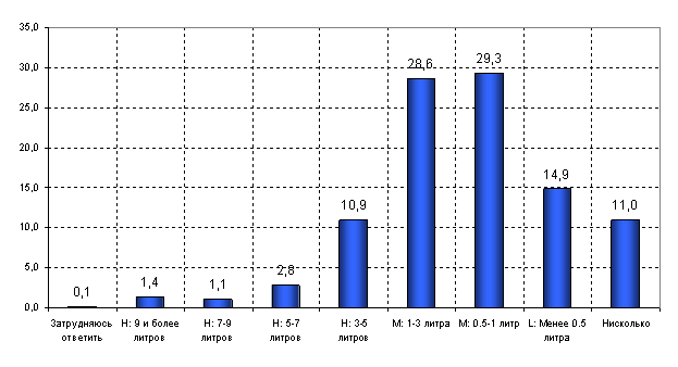 Потребители со слабой интенсивностью потребления пива ("light") составляют 14,9% всех потребителей, выпивающих менее 0,5 литров пива ежемесячно. В принципе, к данной группе потребителей можно также отнести тех потребителей пива, которые пьют пиво редко и представлены на диаграмме столбцом с надписью "нисколько".