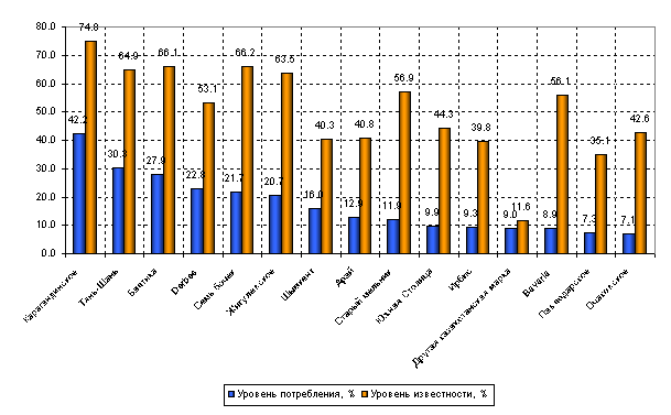 К маркам с довольно высоким уровнем известности среди взрослых потребителей пива в Казахстане можно отнести следующие марки: пиво "Карагандинское" (74, 8%), пиво "Тянь-Шань" (64, 9%), пиво "Балтика"(66, 1%), пиво "Семь Бочек" (66, 2%), пиво "Жигулевское" (63, 5%). Чуть меньшим уровнем известности обладают такие марки, как пиво "Старый мельник" (56, 9%), пиво "Бавария" (56, 1%). Большинство марок с наибольшим уровнем известности среди взрослых потребителей пива относятся к маркам местных, казахстанских производителей.