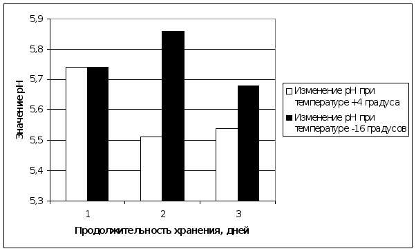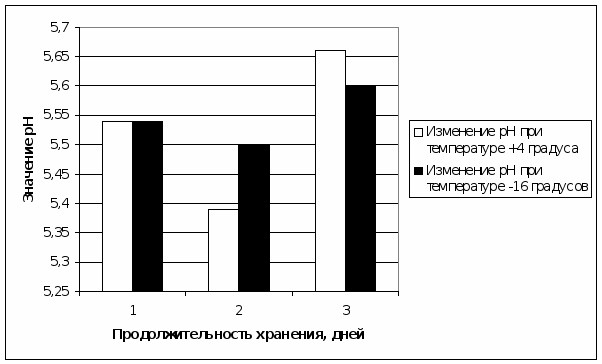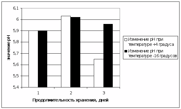 При температуре хранения +4 °С рН мяса курицы, говяжьего фарша, говядины увеличивается, а куриной и говяжьей печени – уменьшается.