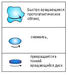 Наблюдаемые свойства галактических дисков находят естественное объяснение в созданных на ЭВМ моделях быстро вращающихся звездных систем. Рассмотрим описанную выше эллиптическую галактику. Если ее протогалактическому газовому облаку придать быстрое вращение еще до образования большинства звезд, то облако приобретет плоскую форму, и распределение звезд будет напоминать диск спиральной галактики. Таким образом, оказывается, что основное структурное отличие эллиптических галактик от спиральных состоит в скорости исходного вращения.