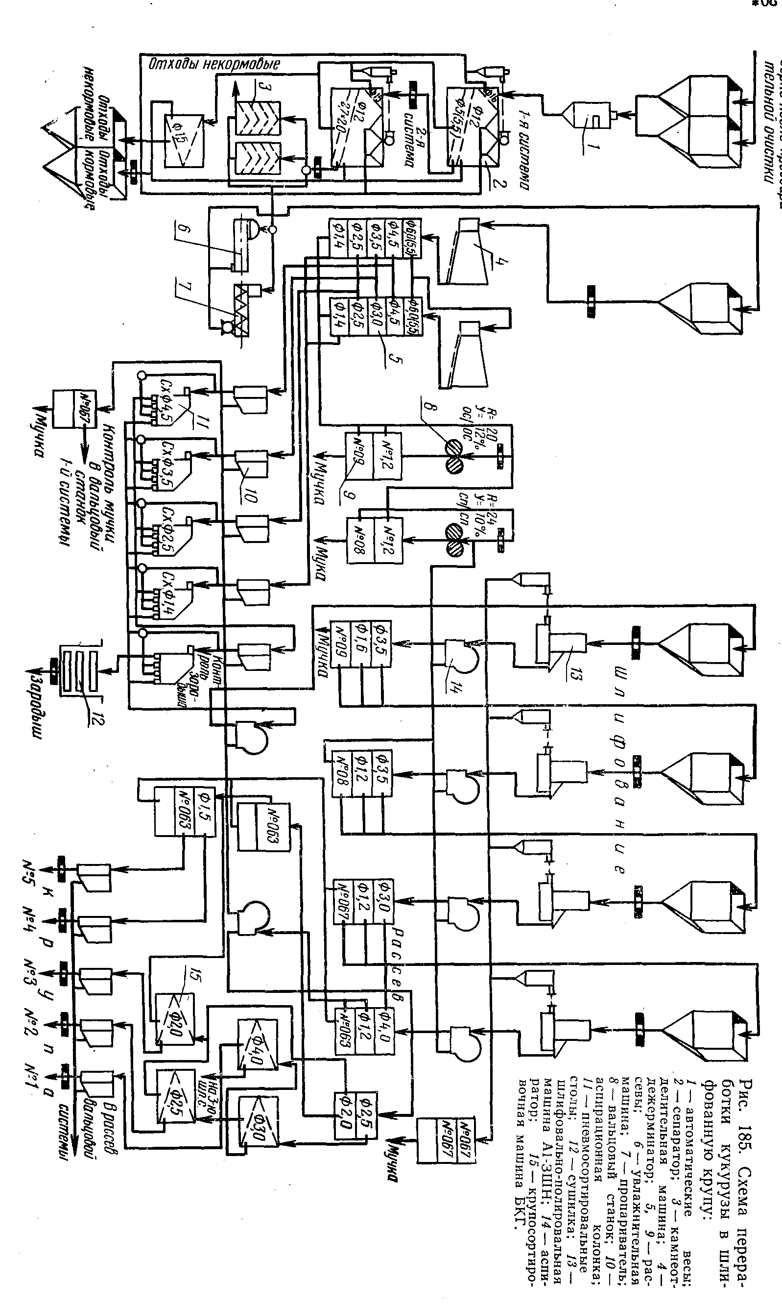 Для измельчения обогащенных на пневмостолах промежуточных продуктов применяют пять систем вальцовых станков и рассевов. Несколько более развитый процесс измельчения по сравнению с предыдущей схемой объясняется большим количеством измельчаемых продуктов.