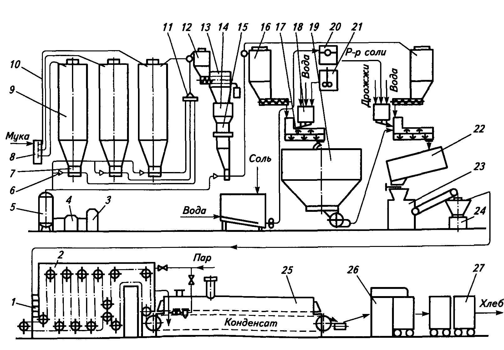 Рис. 1. Машинно-аппаратурная схема линии производства хлеба из пшеничной муки