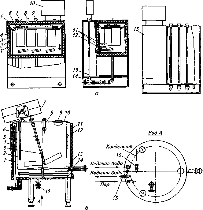 б- Л5-ОЗУ-0,63: 1 - наружная ванна; 2- внутренняя ванна- 3— мешалка; 4— переливная труба; 5 — термопреобразователь сопротивления; 6 — заливной патрубок; 7— привод; 8— моющая головка; 9— конечный выключатель; 10— крышка; 11 — теплоизоляция; 12— змеевик ледяной воды; 13— змеевик пара; 14— выпускной кран; 15 — обратные клапаны; 16— вентиль для слива и подачи воды в рубашку.