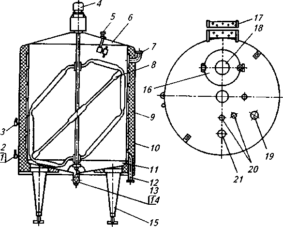 Рис. 8. Аппарат Я1-ОСВ-3. 1— стеклянный термометр; .2 —термометр сопротивления; 3 — пробный кран; 4—привод; 5— моечное устройство; 6—крышка; 7—вход хладоносителя; 8 — мешалка; 9— теплоизоляция; 10 — корпус; 11 — днище; 12— выход хладоносителя; 13 — датчик нижнего уровня; 14 — патрубок наполнения-опорожнения; 15—опора; 16— крышка люка; 17—лестница с площадкой обслуживания; 18— смотровое окно; 19 — светильник; 20 — датчики верхнего уровня; 21— воздушный клапан.