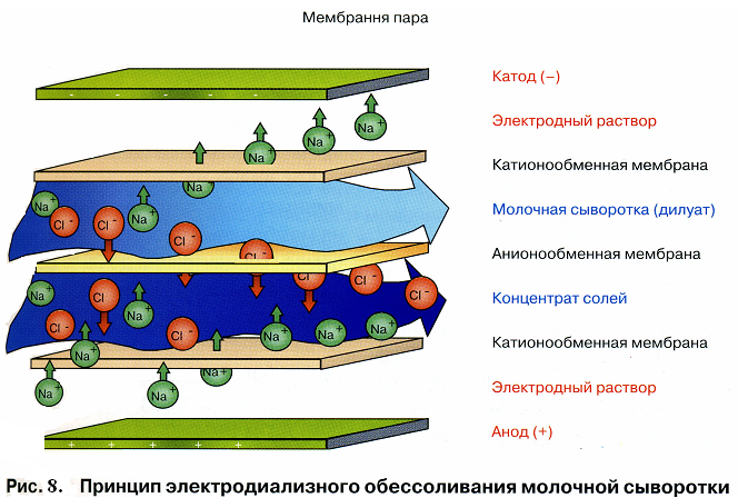 Если необходимо более глубокое обессоливание сыворотки, то применяется электромембранный процесс – электродиализ, принцип действия которого изображен на рис. 8.