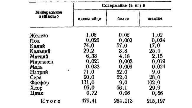 В яйцах содержатся все минеральные вещества и микроэлементы, необходимые для развития живого организма. Большая часть минеральных веществ связана с органическими соединениями, некоторое количество находится в диссоциированном состоянии.