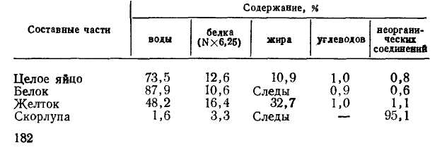 Белки скорлупы, которые образуют ее каркас, имеют строение, близкое к коллагену. Хотя в состав яйца входят белки, выполняющие защитные функции (коллаген, кератин), т.е. не имеющие высокой биологической ценности, содержание этих белков в общем белковом составе не превышает нескольких процентов, так что они не оказывают существенного влияния на биологическую ценность яиц. В белке яйца содержатся все незаменимые аминокислоты в составе, оптимальном для развития живого организма (табл.62).