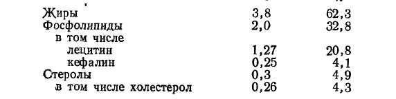 Липиды яйца сосредоточены практически только в желтке, в белке и оболочках яйца их менее 1%. В состав желтка входят простые липиды, или жиры, содержание которых составляет около 2/з всех липидов, и сложные липиды, или жироподобные соединения, в основном фосфолипиды. В большом количестве в желтке содержатся стеролы, в основном холестерол. Примерный состав липидов в курином яйце (масса 60,9 г) следующий: