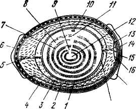 1 - градинковый слой белка; 2 - плотный слой белка (белковый мешок); 3 - внутренний жидкий слой белка; 4 - наружный жидкий слой белка; 5 - градинки; 6 - белковая связка; 7 - темные слои желтка; 8 - светлые слои желтка; 9 - шейка латебры; 10 - бластодиск; 11 - ядро Пандера; 12 - латебра; 13 - подскорлупная оболочка) 14 - надскорлупная пленка; 15 - скорлупа; 16 - воздушная камера; 17 - белковая связка; 18 - желточная оболочка