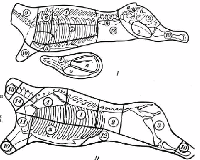 Рис. 1. Схема кулинарной I и торговой II разделки говяжей туши: 1 – спинная часть (толстый край); 2 – поясничная часть (тонкий край); 3 – тазобедренная часть (а – верхний, б – внутренний, в – юоковой, г – наружный куски); 4 – лопаточная часть (а – плечевая, б – заплечная части); 5 – грудинка (мякоть); 6 – подлопаточная часть; 7 – покромка; 8 – вырезка; 9 – шея; 10 – голяшка; 11 – плечевая часть; 12 – пашина; 13 – зарез; 14 – шейная часть.