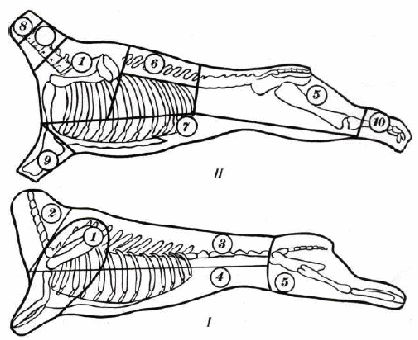 Рис. 3. Схема кулинарной I и торговой II разделки бараней туши: 1 – лопаточная часть; 2 – шейная часть; 3 – корейка с реберной костью; 4 – грудинка с реберной костью; 5 – тазобедренная часть; 6 – спинная часть; 7 – грудная часть пашины; 8 – зарез; 9 – предплечье; 10 задняя голяшка.